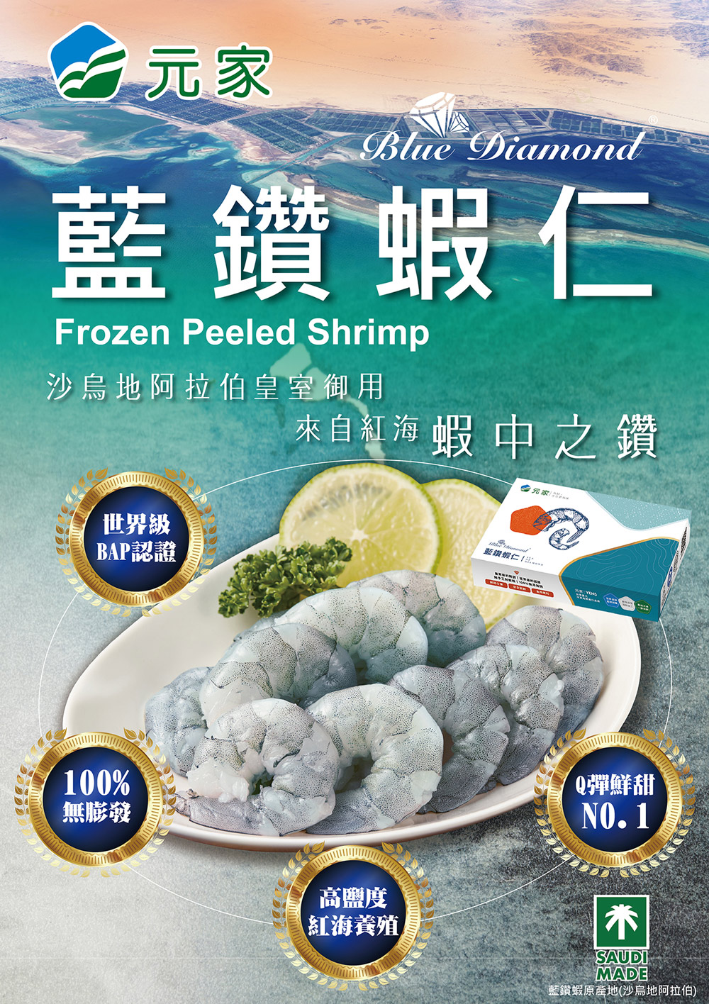 產品特色:原料採用高品質藍鑽蝦,其養殖於全世界鹽度最高的沙烏地阿拉伯紅海海域,造就其肉質Q彈、鮮甜;而藍鑽蝦仁以純手工剝殼、挑腸泥,100%無澎發,原味呈現。小包裝方便使用、衛生安全,適合訴求高品質食材的業者。