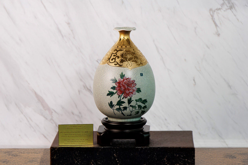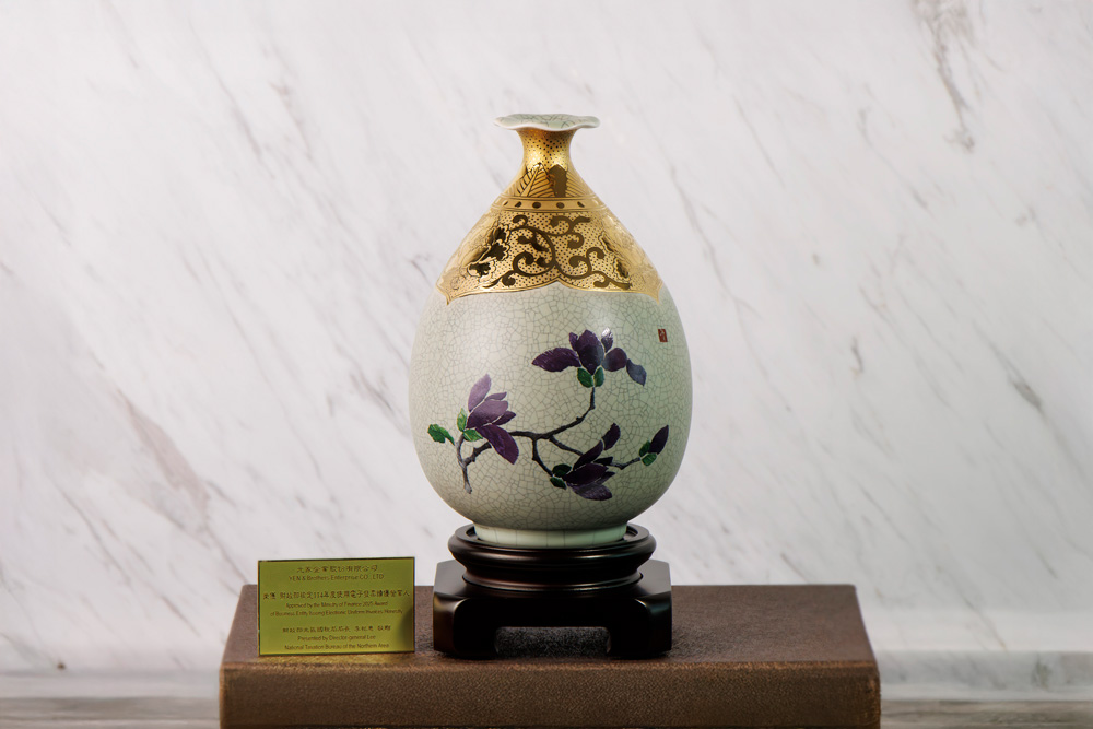 「玉堂春富貴」瓷瓶,玉蘭象徵誠信,牡丹寓意興盛,肯定元家貢獻,更寄望商機無限,邁向永續榮景。