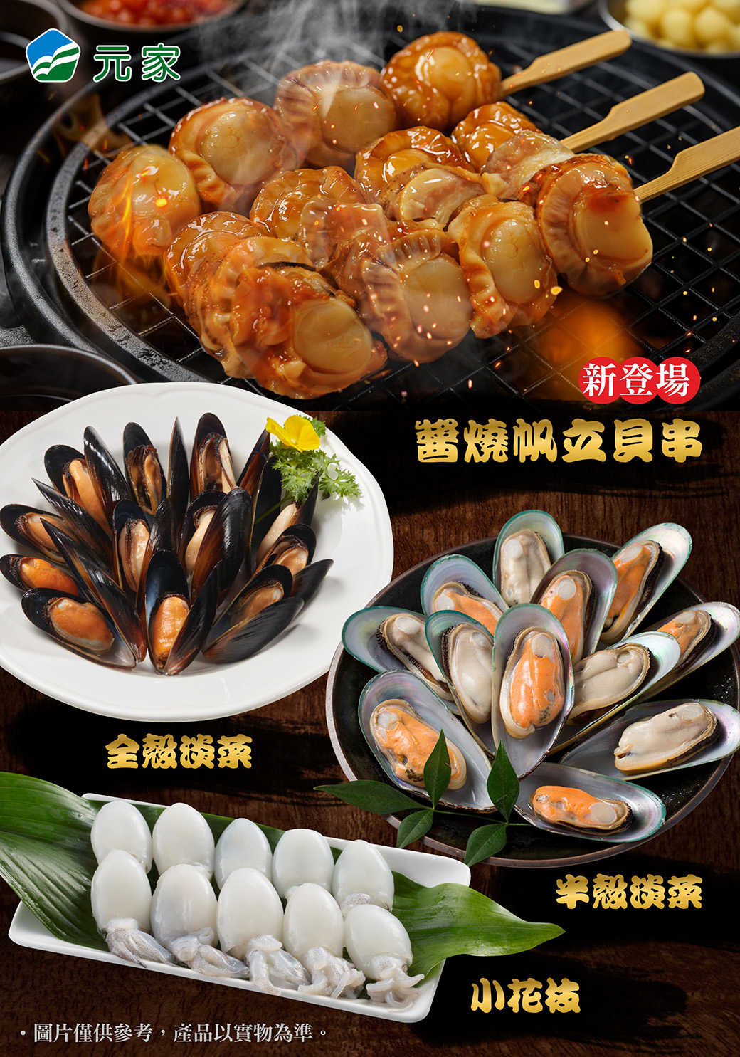 《醬燒帆立貝串、全殼淡菜、半殼淡菜、小花枝》秋季烤物