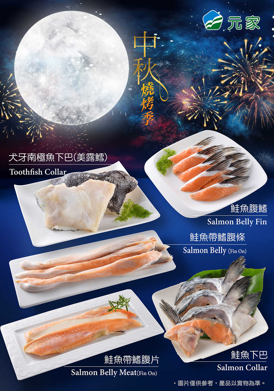 《犬牙南極魚下巴、鮭魚腹鰭、鮭魚帶鰭腹條、鮭魚帶鰭腹片、鮭魚下巴》中秋烤魚