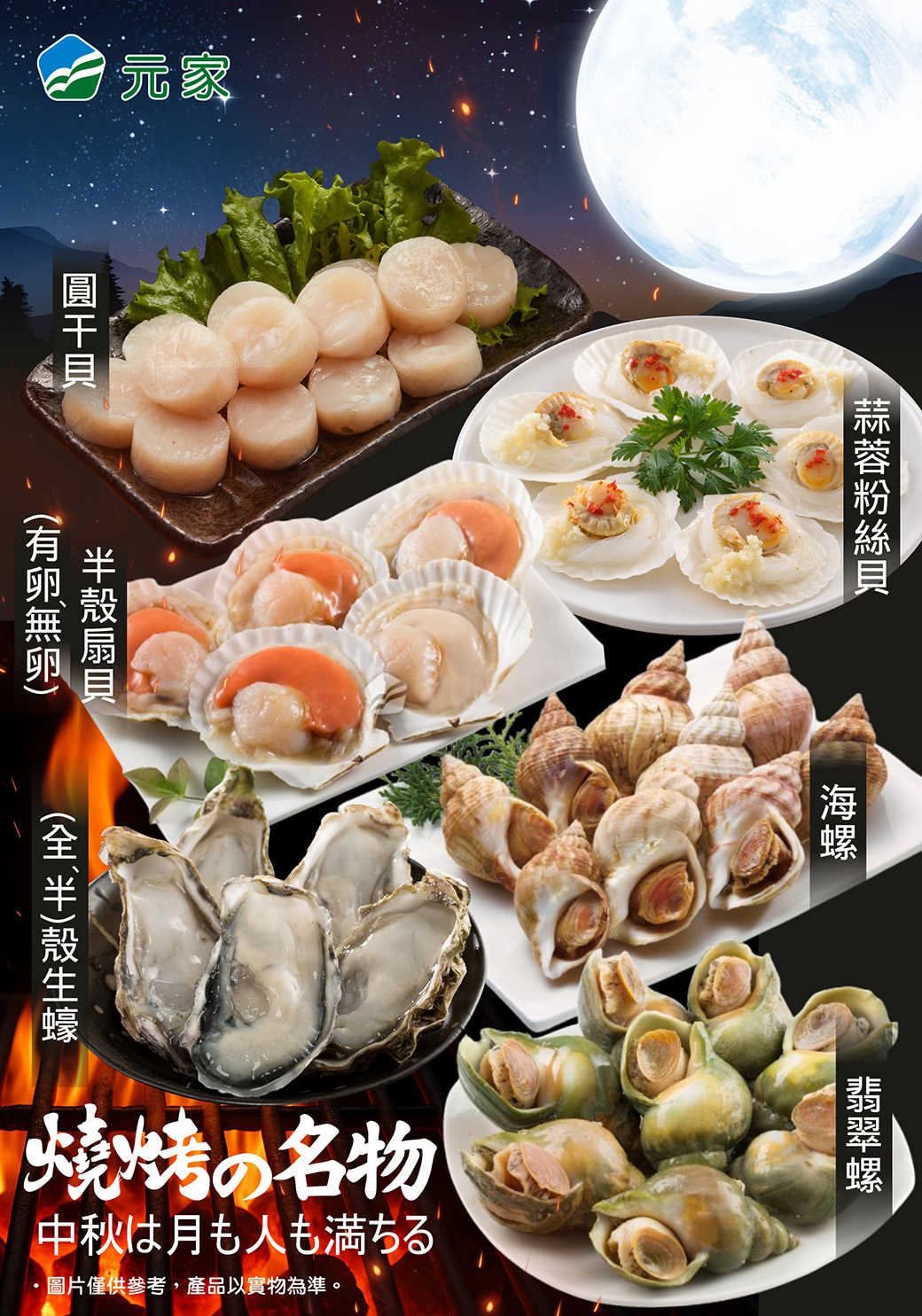《圓干貝、半殼扇貝、蒜蓉粉絲貝、海螺、翡翠螺、生蠔》燒烤名物