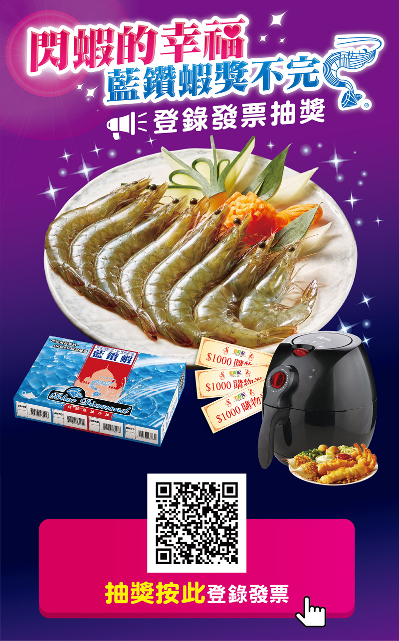 凡活動期間購買《藍鑽蝦》(盒裝)或《藍鑽蝦餐》,只要有購買的發票,登錄活動頁面,就享有氣炸鍋、購物金、藍鑽蝦抽獎資格,買越多發票越多,抽中機會越大,活動即日起至2020年1月底為止。買三盒藍鑽蝦送保冷袋活動亦包含在內,可憑發票參加抽獎。